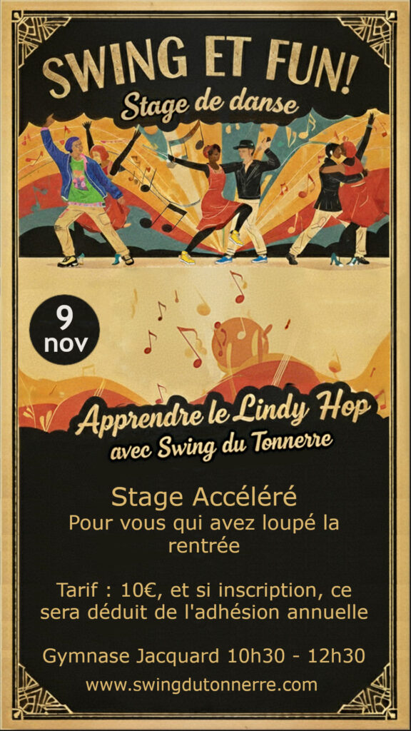 Le 09 novembre nous organisons un Stage Accéléré de Lindy Hop pour celles et ceux qui ont loupé la rentrée et qui souhaiteraient rejoindre les cours. Tous les infos sont ici :
